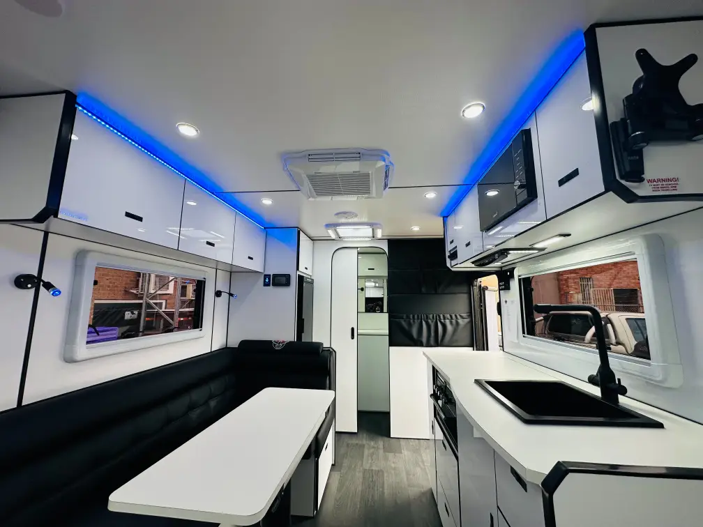 Step into the modern kitchen, where you’ll find a sleek kitchen sink and a convenient mini grill, perfect for whipping up delicious meals while on the go. And with amenities like a 12-volt water pump, a 3.2 kg top-loader washing machine, and a spacious 138L fridge and freezer, you’ll have all the comforts of home at your fingertips.