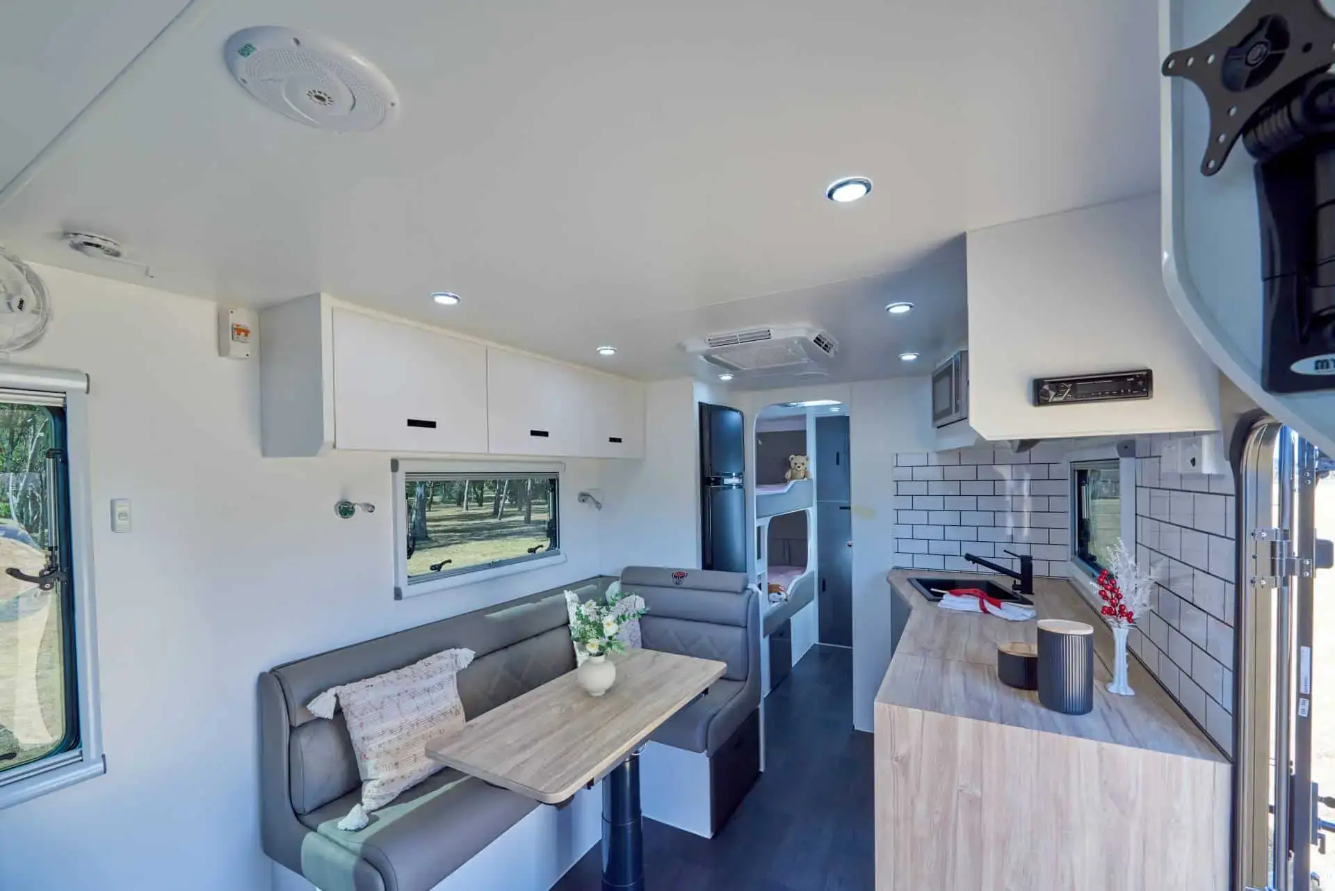 The Riverbank’s angle kitchen is a standout feature, offering highly coveted extra benches with a stylish bamboo-colored texture, adding both functionality and aesthetic appeal to your cooking space. Alongside this, the addition of great-looking roadside bunks provides versatile sleeping options for the whole family, maximizing the use of space without compromising on comfort.